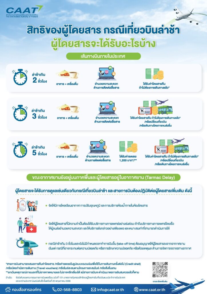 ส่วนในกรณีเที่ยวบินในประเทศล่าช้าหรือยกเลิก ข้อบังคับฉบับใหม่นี้ได้เพิ่มค่าชดเชยหากเที่ยวบินล่าช้าเกินกว่า 5 ชั่วโมง จากเดิม 600 บาท เป็น 1,200 บาท และหากเที่ยวบินยกเลิก จากเดิม