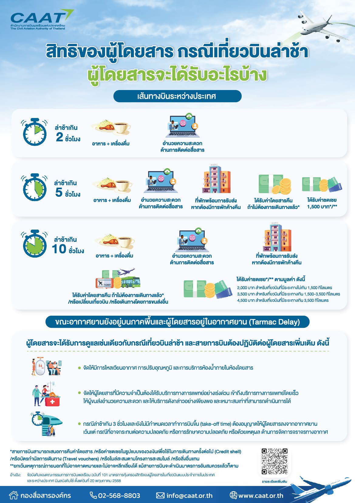 จะเร่งสร้างความเข้าใจให้แก่สายการบินและผู้โดยสารอย่างทั่วถึง เพื่อให้การปฏิบัติตามข้อบังคับเป็นไปอย่างมีประสิทธิภาพ และเกิดประโยชน์สูงสุดแก่ผู้ใช้บริการทุกคน ทั้งนี้ สามารถศึกษารายละเอียดเพิ่มเติมเกี่ยวกับคุ้มครองสิทธิผู้โดยสารได้ที่ https://www.caat.or.th/th/archives/97266